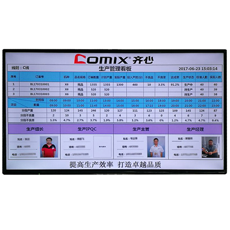 傳統電子看板使用LED屏,顯示數據少,內容單一,并且無法將多條產線組成網絡,進行集中管理和數據存儲。我司研發的液晶電子看板,采用高分辨率,顯示內容豐富,色彩和布局可根據客戶喜好進行設計,同時可通過以太網/無線網絡將工廠內的所有電子看板進行集中管理,并且將實時的生產數據上傳到服務器,管理人員在辦公室就可以實時查看生產進度,返修率等數據。